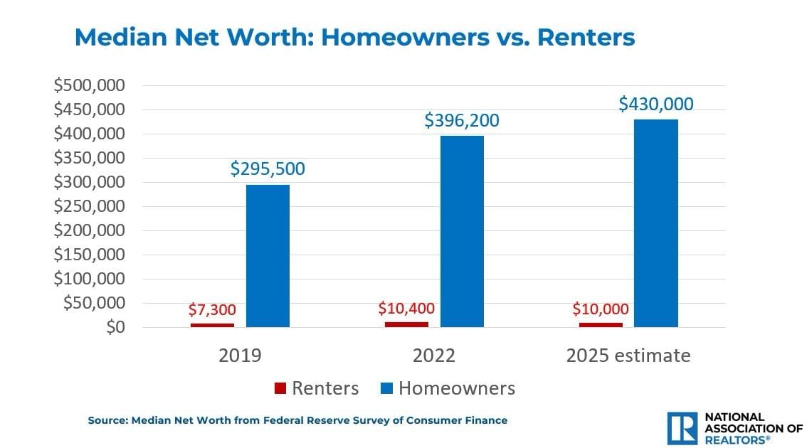 To put that in context: NAR's 2025 research put the median net worth of a homeowner at $415,000, compared to $10,000 for renters. A big part of that gap comes from exactly this — home values running up while owners went about their lives, not only being insulated from climbing home values, but benefiting.