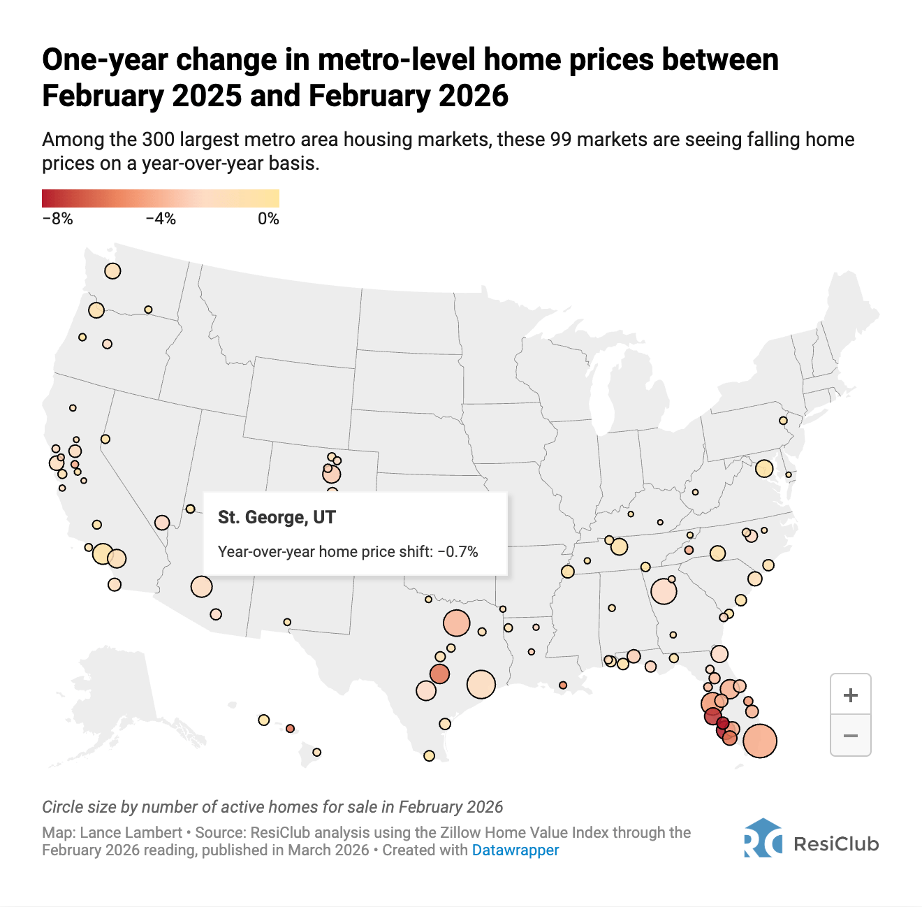 And a big reason for softness in most of these areas is new construction. Builders have been aggressively competing for buyers with rate buy-downs, closing cost credits, and price cuts. That pulls demand away from the resale market, which pushes resale inventory even higher, putting even more downward pressure on prices. It's a cycle that's been playing out for about two years now.