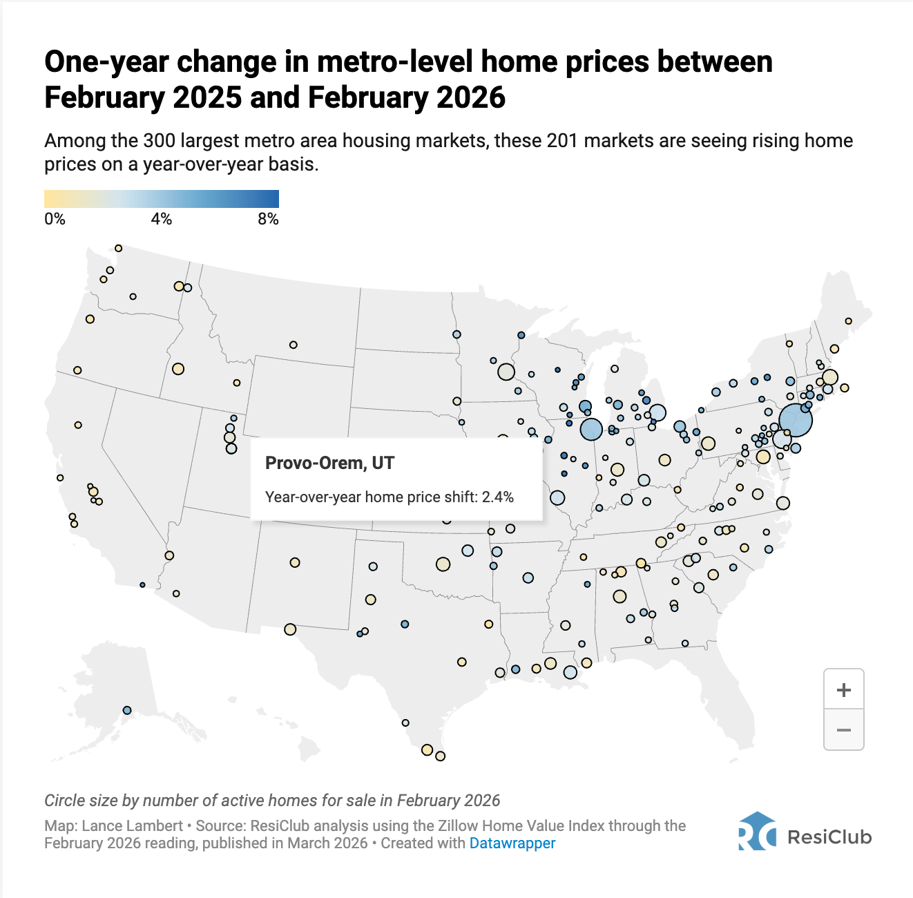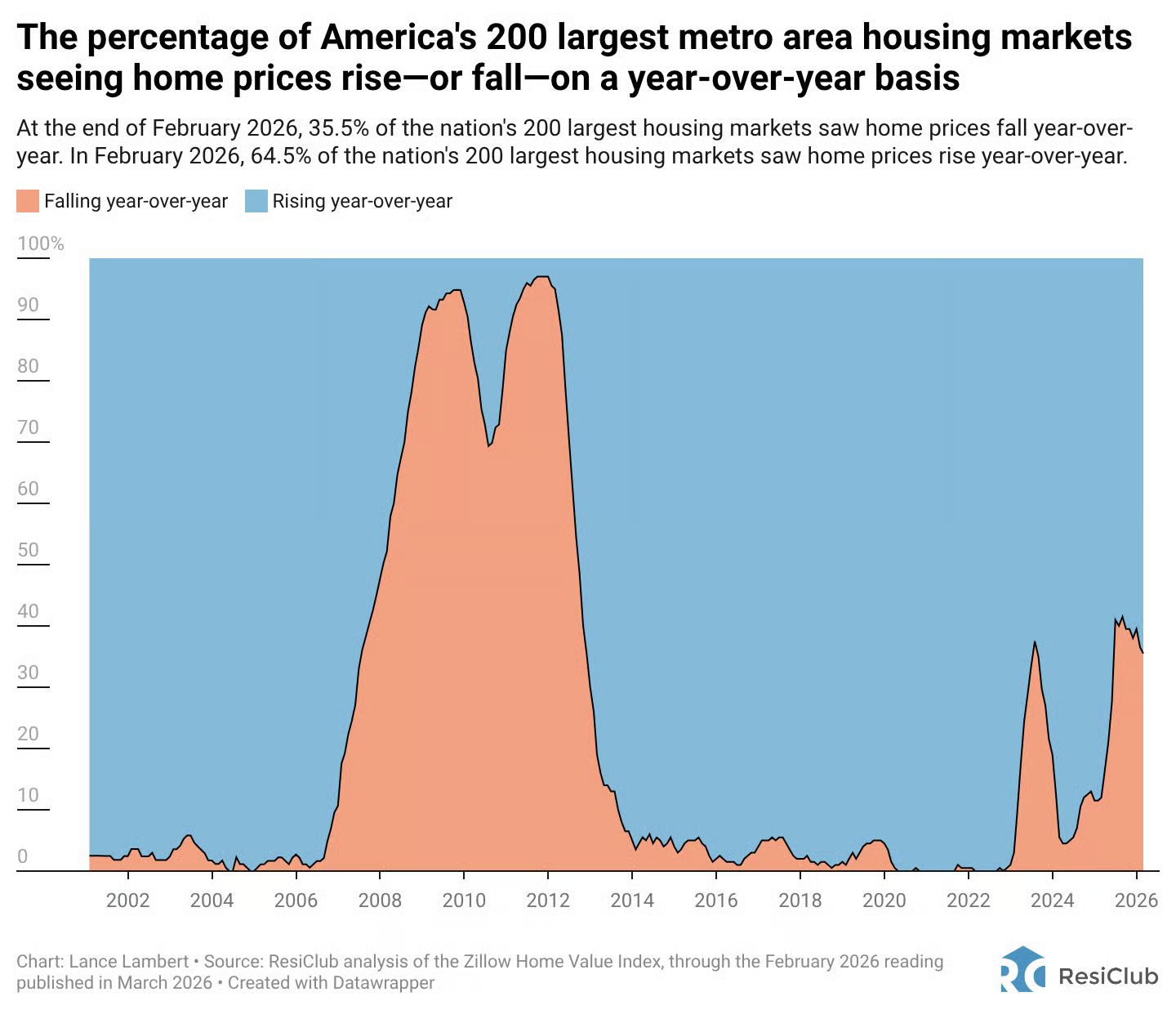 But here's the thing. That number has actually stabilized over the past eight months. Earlier in 2025, the number of markets seeing declines was climbing fast. It peaked around 110 metros in the summer, and since then it's held steady right around 100. ResiClub expects that number to start shrinking in the months ahead.