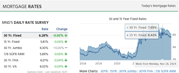 The mortgage rate roller coaster has started slowing down. According to Mortgage News Daily, the average 30-year fixed rate now sits at 6.28%—down from last year’s 7.05%. But I wouldn’t expect any major dramatic drops from here.