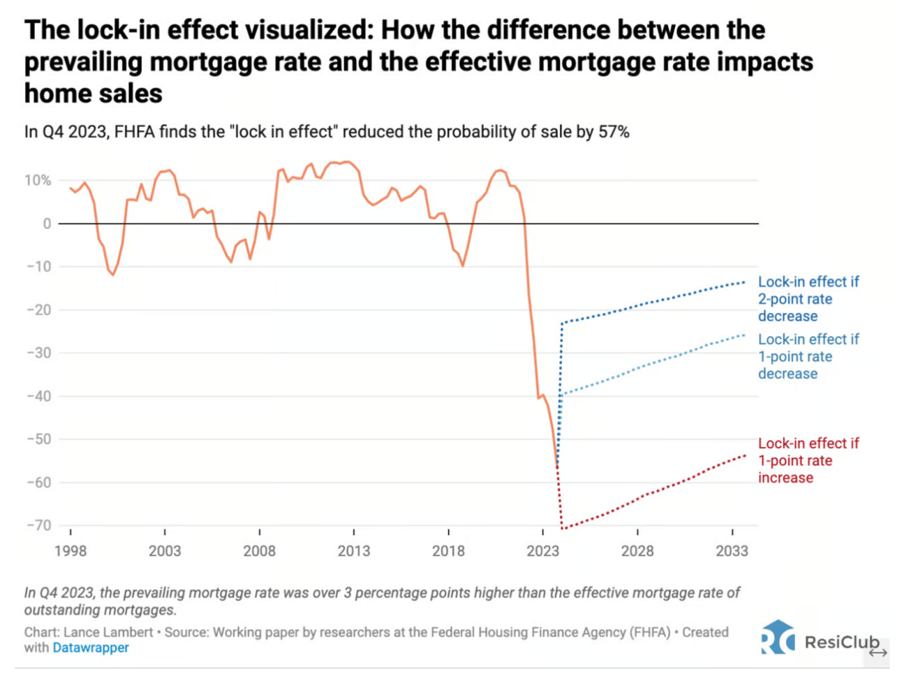 In March, the FHFA released a comprehensive 52-page working paper analyzing how homeowners with lower mortgage rates are reluctant to sell due to the prospect of higher rates on new mortgages. This phenomenon, known as the rate lock-in effect, has resulted in approximately 1.3 million "lost" existing home sales from Q2 2022 to Q4 2023.