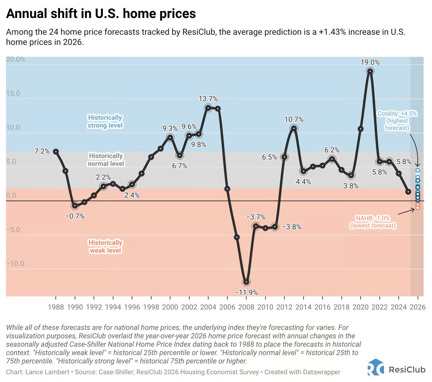 Mortgage Rates: The 21 forecasts average 6.18% for 2026—essentially where we are today. If you've been waiting for rates to drop dramatically, this data suggests it's time to adjust expectations (keep in mind these projections do not account for mortgage rate buy-downs that would allow for an even lower rate).