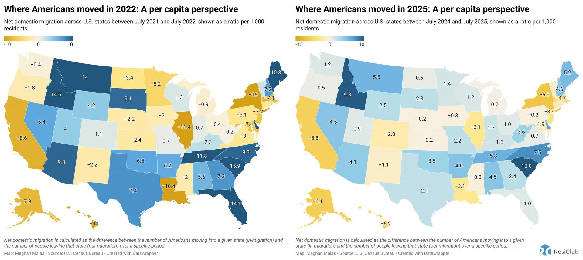 While states like South Carolina, Idaho, and North Carolina are leading the nation in attracting new residents (on a per-capita basis), the massive migration waves we saw during the pandemic have officially cooled off. Texas and Florida are still gaining people, but it's nothing like the flood of 2021-2022.